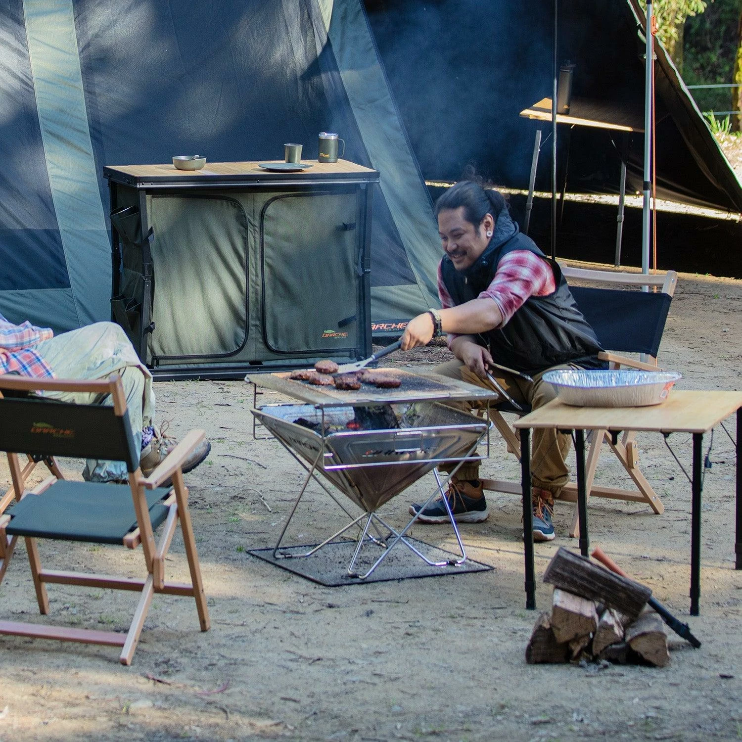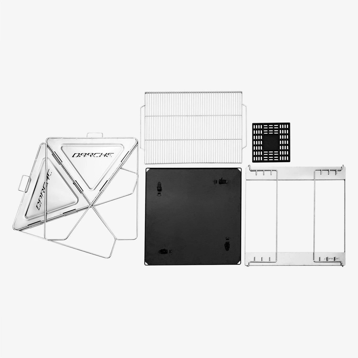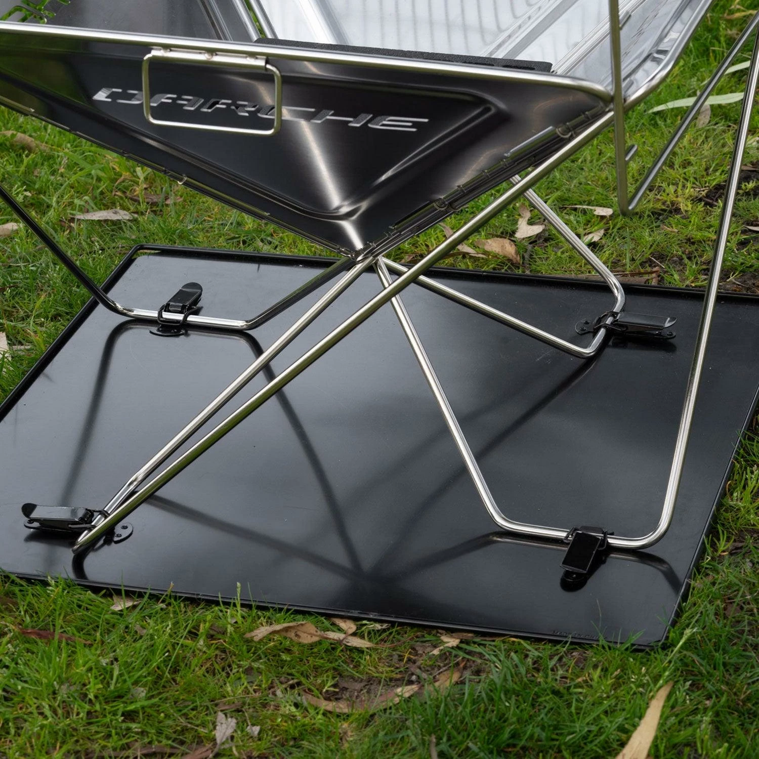 The Darche BBQ is a huge leap forward in camp cooking. The big brother of both the 440 and 310 BBQ’s. The 630 features the same innovative design, just scaled up for big feeds. The clever design provides both a stand-alone heat source and a functional BBQ with a height-adjustable grill plate to suit your cooking style. Use it as a fire pit on cold nights and cook enough food for a family over hot coals – It’s the biggest cooking accessory in your camp cooking arsenal.