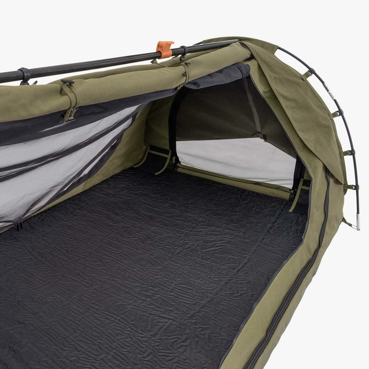 With full length canvas storm flaps on both sides, you get uninterrupted views from sunrise to sunset, perfect for those campers that want to drift off under the starry night sky. Setup takes a couple of minutes with two composite poles, plus the unique trigger lock ridge pole. Inside is spacious with plenty of head room to move around. With two massive super-fine mesh doors and two zip down ventilation windows with storm flaps, this swag has unparalleled ventilation, keeping you cool while ensuring you’re well protected from the elements all year round. The canvas storm covers can either be rolled up or converted to awnings, giving you extra shade and protection in all weather conditions. The Dusk To Dawn is made from premium 420gsm ripstop polycotton canvas with an impressive PU 800mm waterhead rating. There’s also internal seam sealing and a reinforced, heavy-duty 600gsm PVC bucket floor to keep you dry in rainy conditions. This swag includes a premium quality, high-density 70mm foam mattress with a removable cover. The canvas swag bag is made from the same quality canvas as the swag and is great for storage and protects the swag when you’re on the road.Â