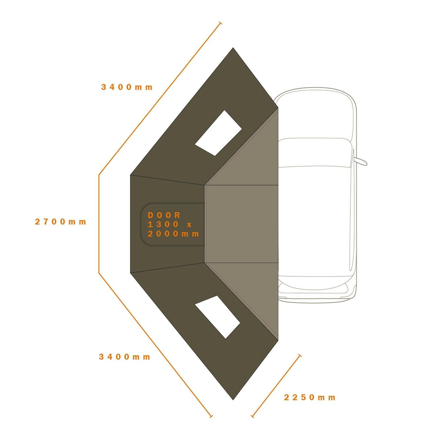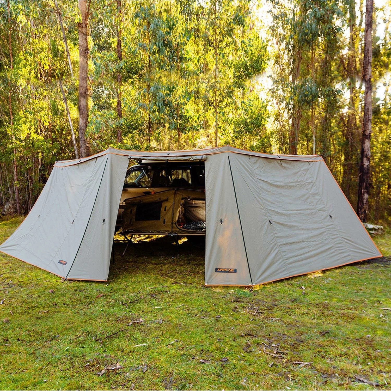 Ensure awning is anchored with supplied guy ropes and pegs at all times when in use.