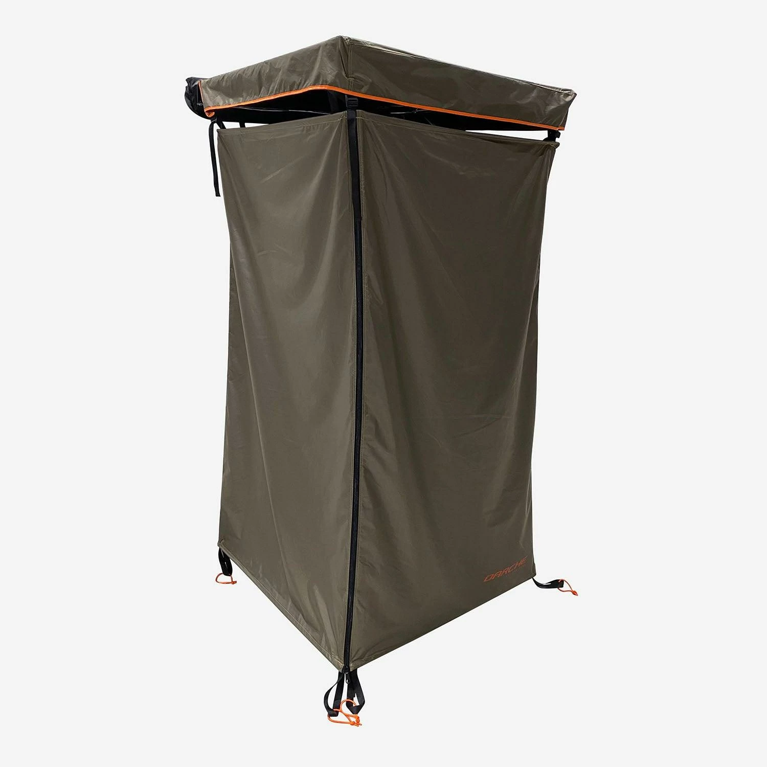 The polyester walls include a black privacy coating, making it perfect for showering, changing or use as toilet cubicle and the detachable roof can be removed or rolled back for extra ventilation or so you can enjoy the sky views while you shower.
