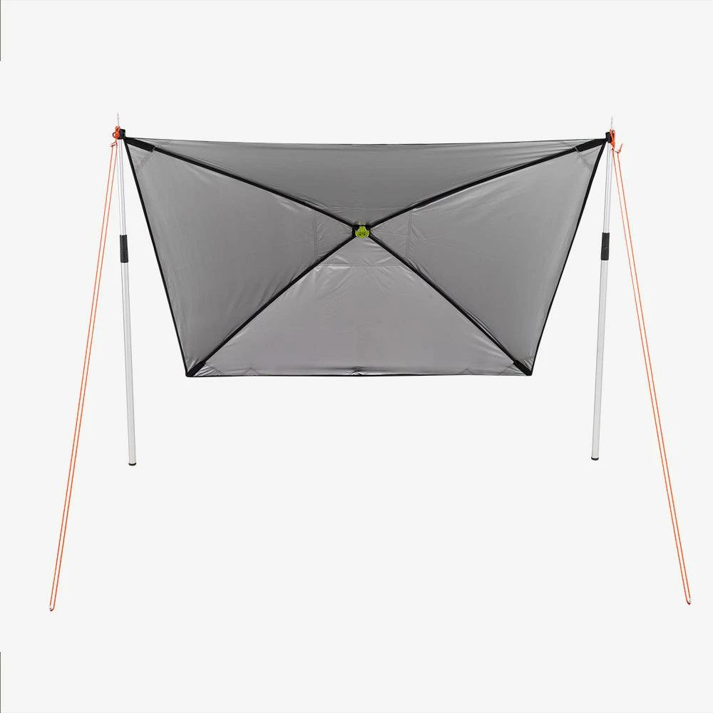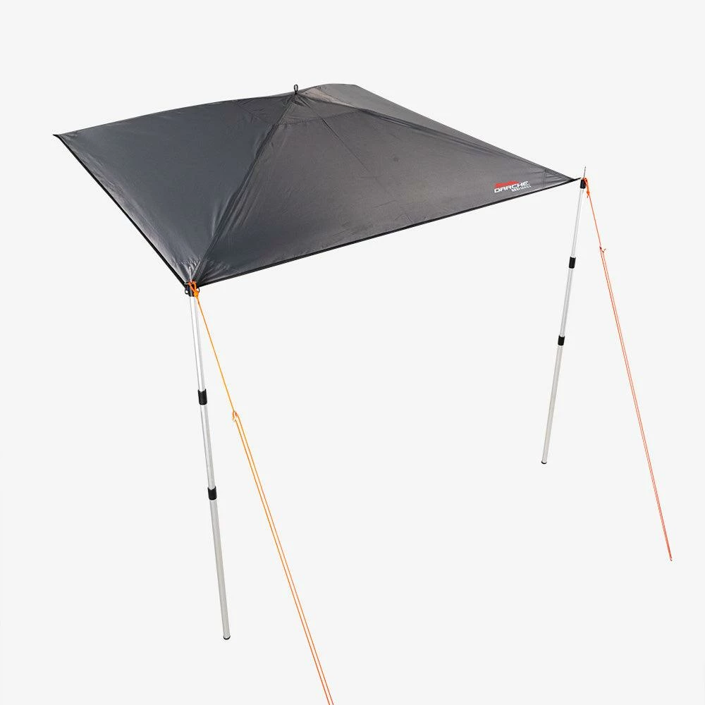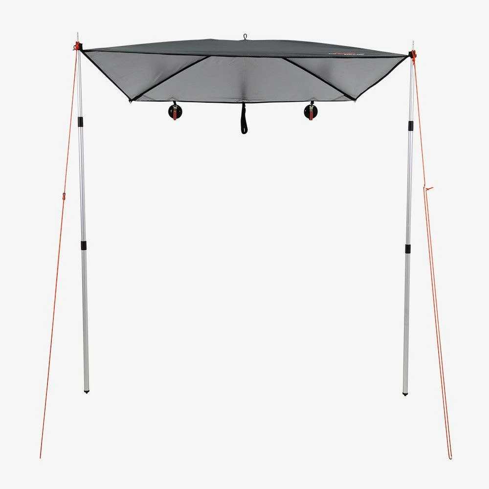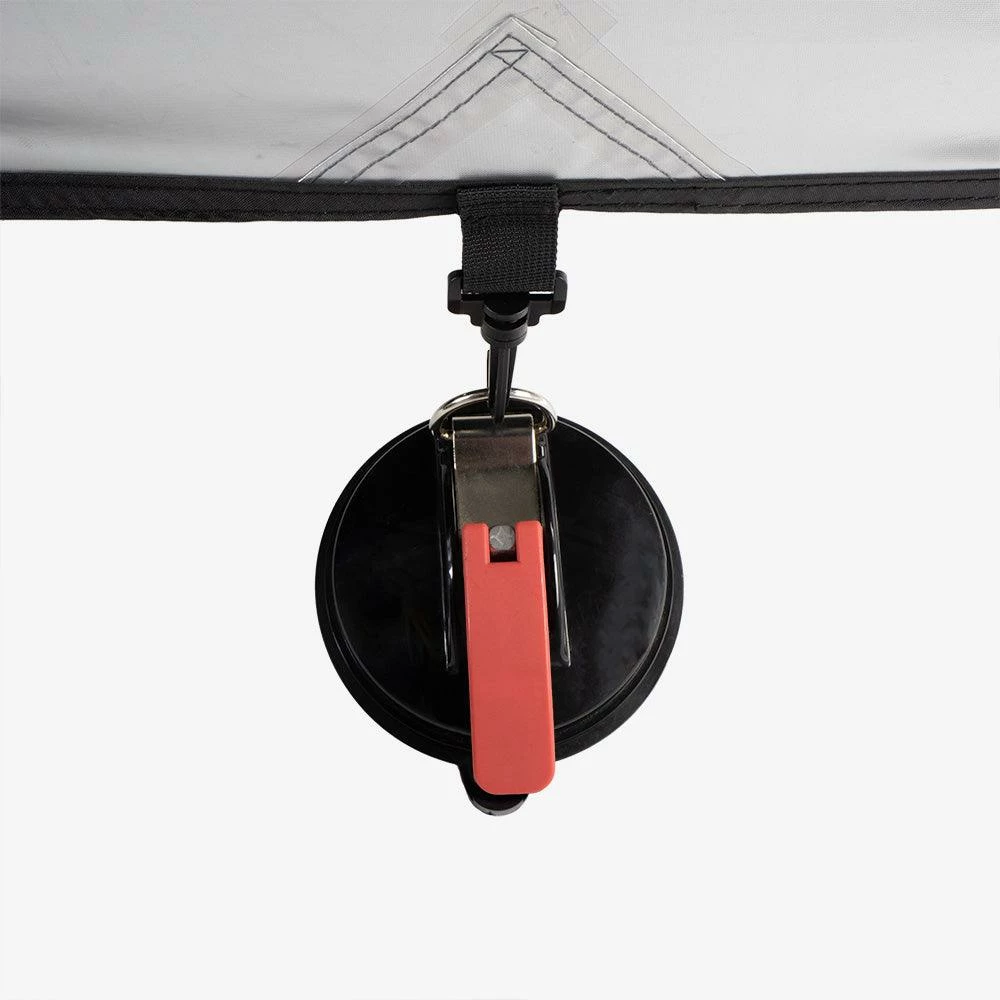 Strong and lightweight, the All-Rounder attaches to vehicles and smooth vertical surfaces via the included suction cups on one end. And strong aluminium telescopic poles on the other. Remove the suction cups and you’ve got a stand-alone shelter for the campsite or beach.