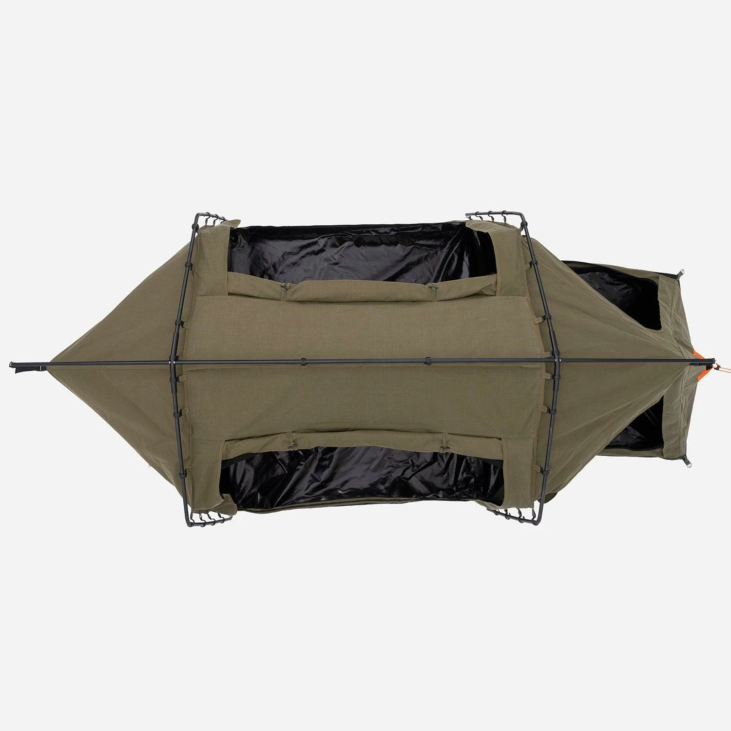 This new design has even larger doors than the standard Nebula, that run into the roof line. The larger opening makes it easier to get in and out of the swag, and allows you to stand up without getting out of the swag. With the storm covers rolled up, you’ll get starry night views as you drift off in ultimate comfort. The storm covers can even be used as an awning for extra protection when you step out during those cold and rainy mornings (awning poles sold separately). The huge doors on five sides of the Nebula Plus + provide terrific cross ventilation as well as panoramic views on your next off-road adventure. All doors include dual-zippered canvas and super-fine mesh, keeping you cool in the heat and ensuring you’re well protected from the mozzies all year round. The Nebula Plus + swag is made from premium 420gsm ripstop polycotton canvas with an impressive PU 800mm waterhead rating. There’s also internal seam sealing and a reinforced, heavy-duty 600gsm PVC bucket floor to keep you dry in those rainy conditions. This swag includes a mattress upgrade – now featuring our premium quality, high-density 70mm foam mattress with a removable cover, making for an easy clean up at the end of a long trip. The canvas swag bag provided is perfect for storage and protection while you’re on the go – throw it in the back of the ute or on the roof rack and get on the road.
